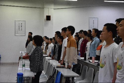 会议第一项,全体成员起立,齐唱国歌。第二项,康霓老师宣读培训安排,第三项入党积极分子学生代表崔志峰发言。