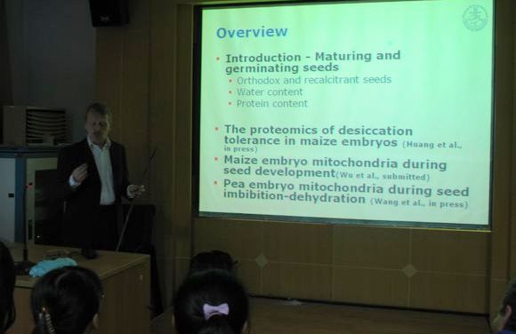 10月11日上午,在3200威尼斯vip二楼多媒体,来自丹麦奥尔胡斯大学农业科学学院遗传和生物技术系Ian Max Møller 教授、中国科学院植物所程红焱副研究员、中国科学院植物研究所研究员宋松泉博士为广大师生分别做了题为“Approaches to study seed desiccation tolerance”、种子休眠与萌发的研究进展、种子顽拗性及其种质资源的长期贮藏的报告,来自3200威尼斯vip、生命学院、园艺等学院近70余名师生参加了报告会。会后,Møller 教授同学院师生进行了座谈,在学院专家的陪同下参观了学校实验平台。