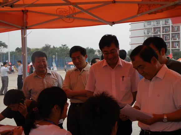 孙其信校长见有现场报到的新生,亲切询问了他们的籍贯、报到的具体情况等。当他得知新生对学院的接待工作感到满意时,十分高兴。他还鼓励新生到校后要尽快适应大学生活,努力充实自己的大学生涯。