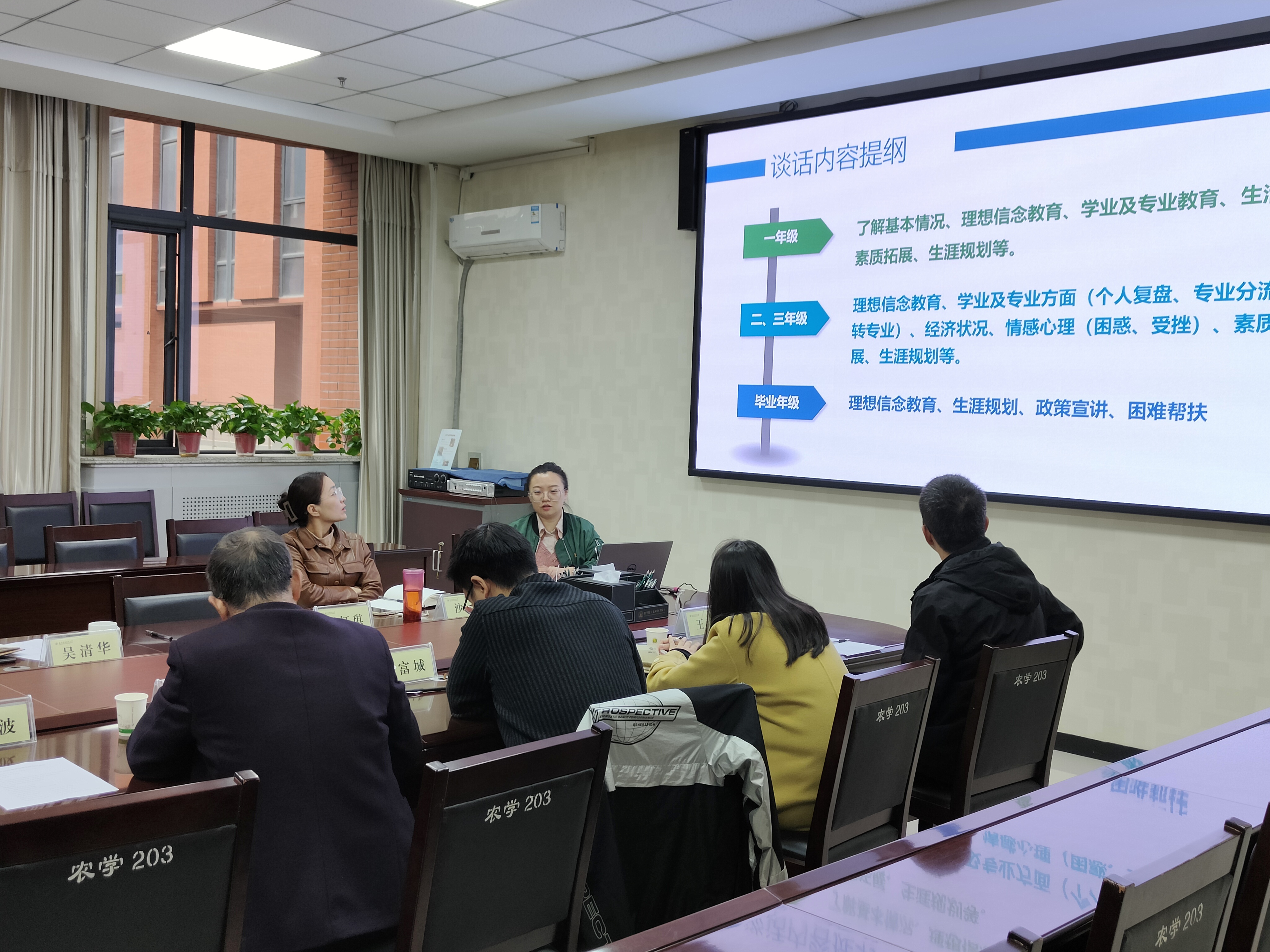 会议伊始,邀请学生处教育科曹姗老师进行班主任面对面及学生生涯规划手册培训。曹姗老师分别就谈话学生类型、谈话时间、谈话流程、内容提纲、谈话记录、辅导猫使用等内容进行详细讲解,同时用谈心谈话记录案例为班主任老师解释了与学生谈话的注意事项,指出班主任老师要利用好学业生涯规划手册,有效帮助学生开展学业生涯规划。