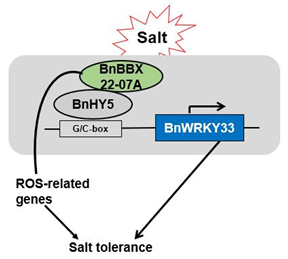 近日,学院黄镇教授领衔的油菜种质资源创新及遗传育种团队在油菜耐盐基因挖掘方面取得了突破性进展,利用图位克隆技术克隆了耐盐油菜品系2205中的耐盐基因BnBBX22.A07(已获专利保护,专利号ZL202010246772.9,图1),并对其功能进行了深入解析。这项研究成果日前在《Plant, Cell & Environment》上发表,论文标题为“The B-box transcription factor BnBBX22.A07 enhances salt stress tolerance by indirectly activating BnWRKY33.C03”,揭示了BnBBX22.A07通过介导活性氧的积累和BnWRKY33.C03的表达调控油菜耐盐性能的新机制。已毕业博士研究生张燕为论文第一作者,黄镇教授为通讯作者。