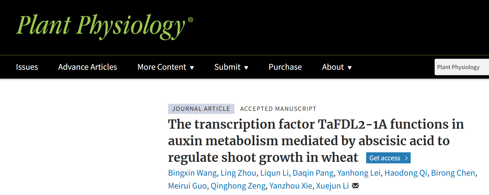 近日,学院李学军教授团队在国际著名学术期刊《植物生理》 ( Plant Physiology )在线发表了题为“The transcription factor TaFDL2-1A functions in auxin metabolism mediated by abscisic acid to regulate shoot growth in wheat”的研究论文,该研究揭示了抗旱基因 TaFDL2-1A 作用于ABA介导的生长抑制路径,通过促进 TaGH3.2 和 TaGH3.8 表达,加快生长素代谢,进而调控小麦地上部生长的分子机制。