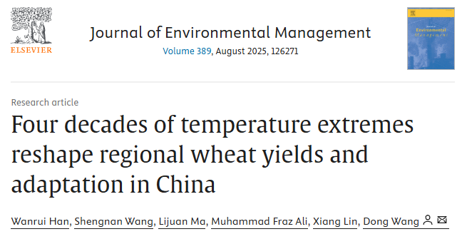 近日,3200威尼斯vip王东教授团队在国际期刊《Journal of Environmental Management》发表题为“Four decades of temperature extremes reshape regional wheat yields and adaptation in China”研究论文。威尼斯vip官网2022级博士生韩婉瑞为论文第一作者,王东教授为论文通讯作者。
