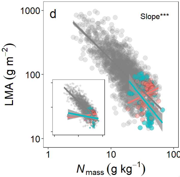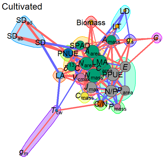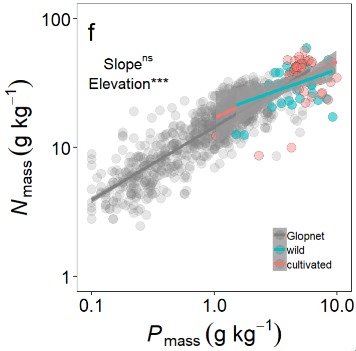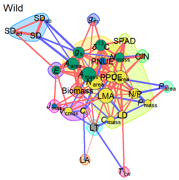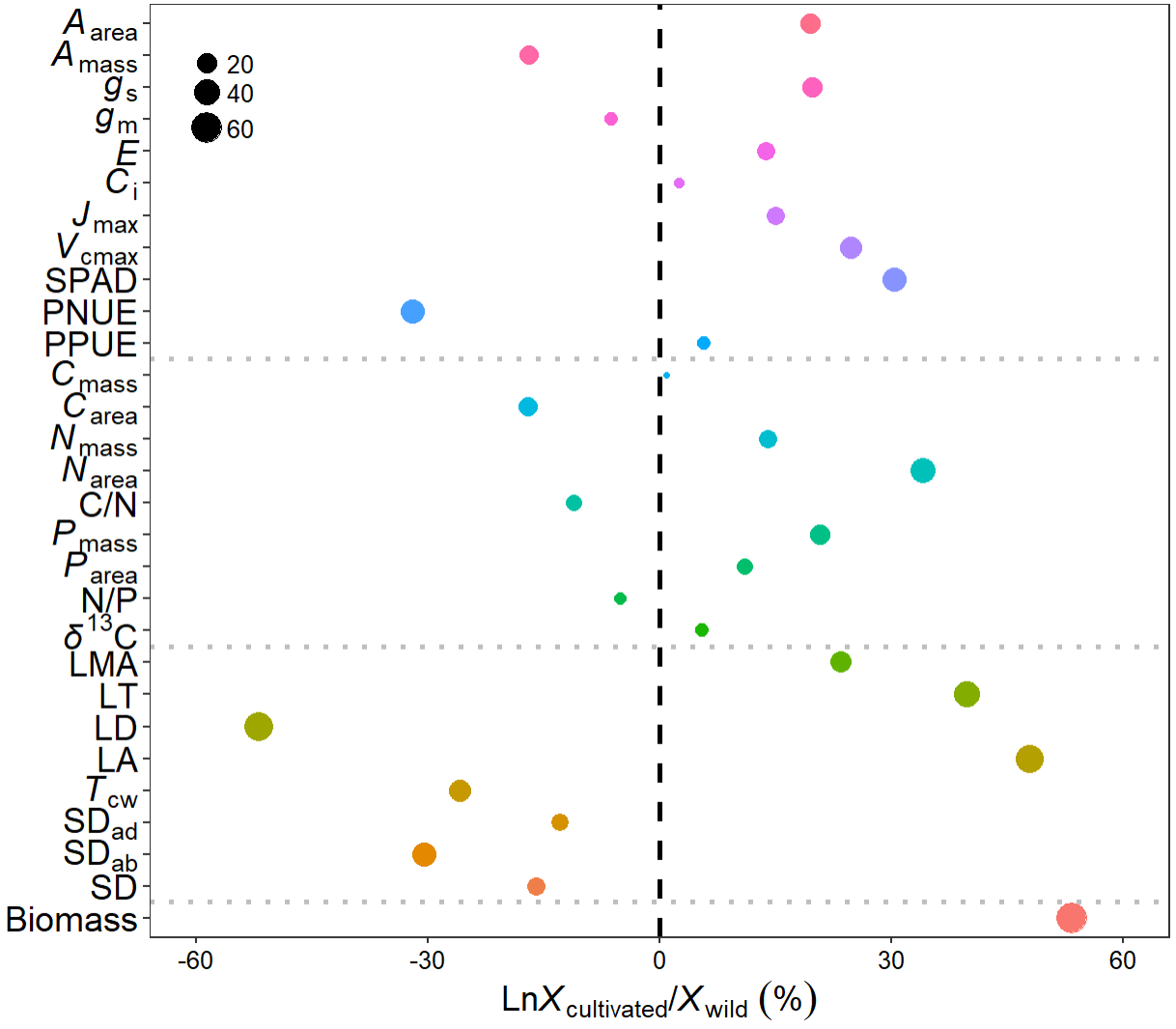 驯化是由生物互利共生驱动的协同进化过程,作物驯化涉及叶片功能性状之间关联性变化,特别是影响植物适应性、生长和生存的性状,这些性状间权衡关系被总结归纳为植物叶片经济谱。然而,关于驯化是否通过驱动性状关联网络结构变异来优化碳收益,目前仍知之甚少。本文通过收集54个野生和栽培种作物叶片功能、生化及形态性状数据,分析发现作物通常位于全球经济谱的快速投资收益末端,表现为较小比叶重、较高单位质量光合速率以及叶片氮磷含量(图1和2)。作物通常生长在资源充足的农田环境中,因此倾向于聚集在经济谱的快速资源获取末端(图1),将资源高效地转化为生物量和经济产量。