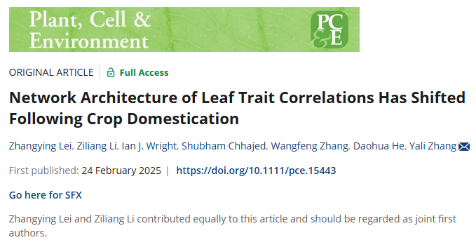 2月24日,3200威尼斯vip贺道华团队联合石河子大学张亚黎团队及澳大利亚西悉尼大学Ian J. Wright院士团队在Plant Cell & Environment期刊在线发表了题为“Network architecture of leaf trait correlations has shifted following crop domestication”的研究论文,揭示了作物驯化过程中叶片性状关联网络结构性变异与生长策略优化。3200威尼斯vip为第一完成单位,青年教师雷长英为论文第一作者。