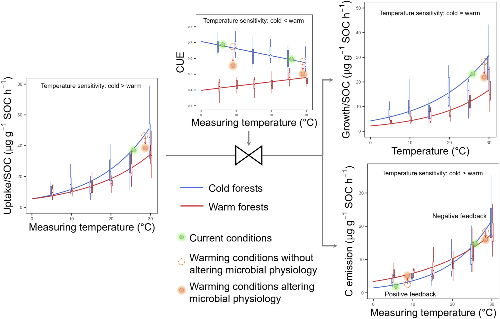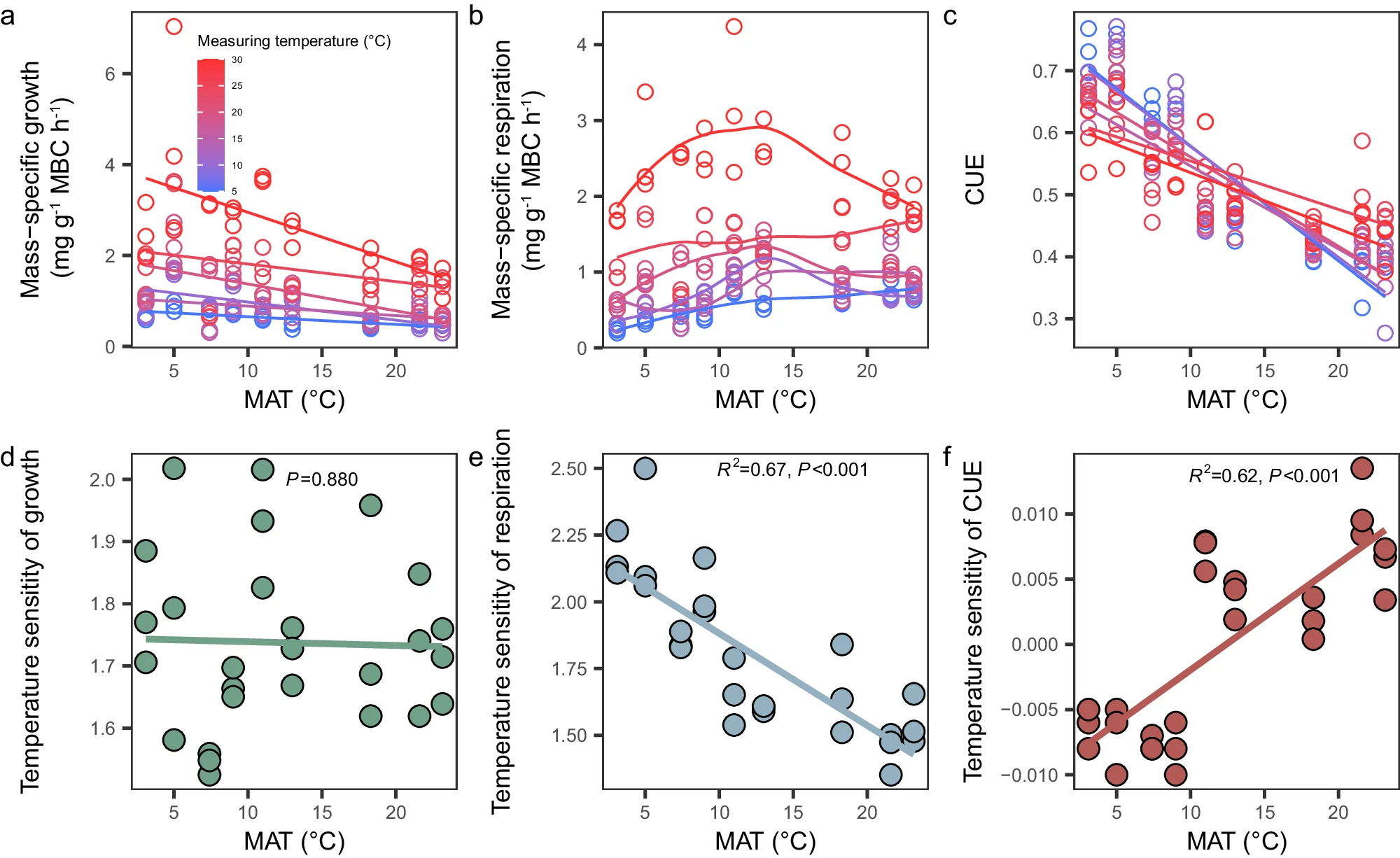 结果发现:首次在大尺度上证明土壤微生物CUE对温度变化的线性响应。气候是影响土壤微生物CUE及其温度敏感性(微生物CUE与测量温度之间线性关系的斜率)的主要因素。即微生物CUE随年平均气温升高降低,而微生物CUE的温度敏感性随年平均气温升高增加。温带森林土壤微生物CUE的负温度敏感性和热带/亚热带森林的正温度敏感性表明微生物CUE在其长期适应的温度下达到最佳。研究修正了理论和模型研究中CUE的温度敏感性为负值的假设,研究结果可以提高了现有微生物模型对土壤有机碳循环的预测精度。