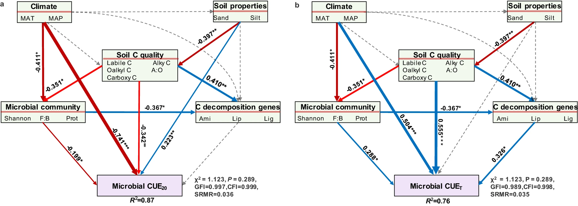 图1:土壤微生物CUE及其温度敏感性的气候依赖性