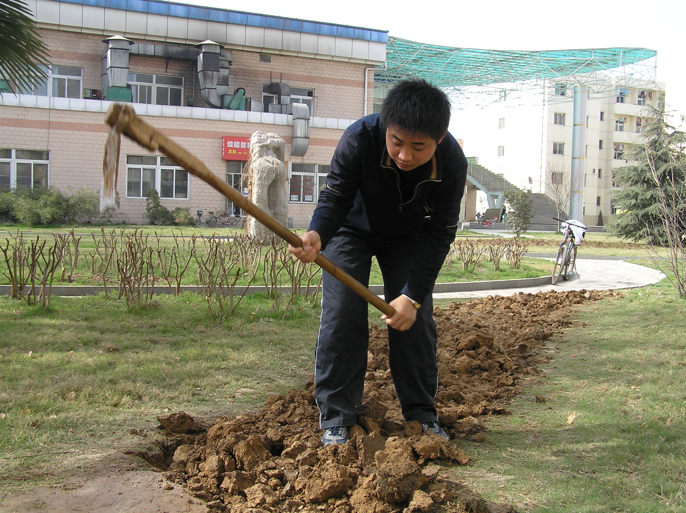 图1:一名同学正在开垦草坪里的小路