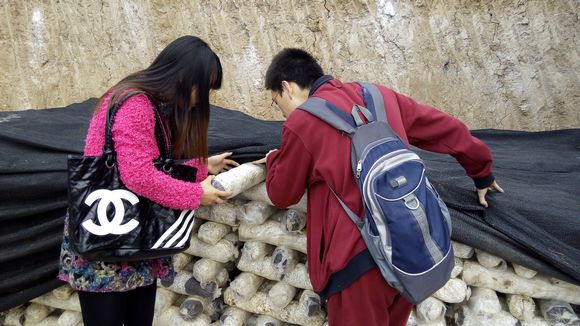 队伍成员与大棚工作人员走进大棚,了解到目前香菇还在装棒阶段,到出菇日还需近三个月的时间。据大棚负责人介绍,近日天气降温迅速,导致香菇育种棒30%以上出现棒苗感染细菌、出现坏死现象。他揭开一面厚毛毯指着长满了青霉的香菇基座告诉我们,这些坏了的香菇棒已经不能用了。