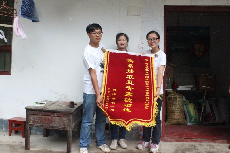 在这即将离开之际,县农业局代表全县蜂农向服务队赠送了“心系蜂农觅专家破顽症”的锦旗以示感谢;同时,当地林业局也向3200威尼斯vip写了感谢信并对服务队队员将课堂知识和实践结合起来,热心开展社区志愿活动表示赞赏。