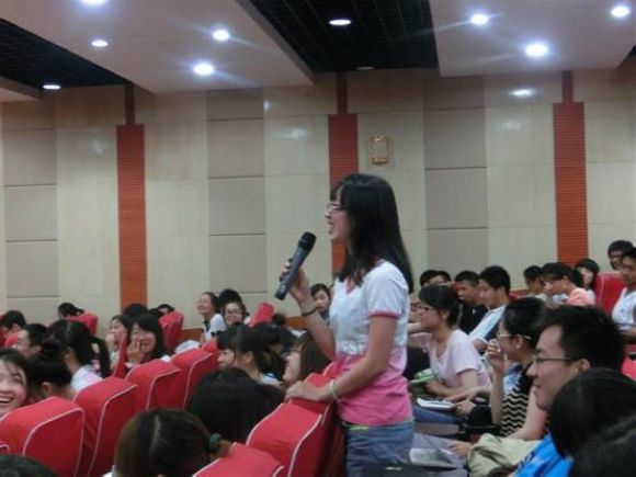 刘婷婷学姐用平和而风趣的语言讲述了自己大学四年的学习及生活经历。她就如何正确处理学习与工作之间的关系,如何让自己的大学生活更有意义,如何与同学、老师、上级和谐相处等问题为大家做了详细解答。她着重强调了大学四年间英语学习的重要性,并且建议学弟学妹们多给自己创造机会,多多参与实践,开阔视野,增强自信,争取更好的发展。