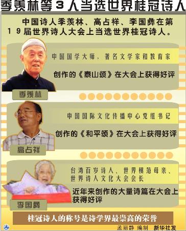 中国诗人季羡林、高占祥、李国彝1日在第19届世界诗人大会上当选世界桂冠诗人。桂冠诗人的称号在诗学界被认为是最崇高的荣誉,只有诗力深厚的诗人才有资格获得。
