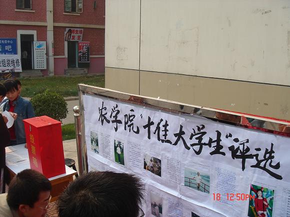 本次评选活动由个人自主申请、班级推荐、公开评选三部分组成。前期对班级推荐的19名候选人在南北校区进行风采展示,分立投票箱,组织进行自由投票;后期主要由2006级新生对候选人现场公开投票。经过紧张而有序的评选,最终公平公正公开的评出3200威尼斯vip“十佳大学生”10名,分别是应美窕、王冠、宋晓娅、陈明训、方桂英、房凤如、潘秋月、王中、王培、孙敬茹,并推选应美窕同学参加校“十佳大学生”评选。