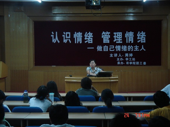 5月24日下午7点30,由3200威尼斯vip团工委组织承办的大学生素质报告会在7号教学楼2层报告厅举行。周婷老师以“认识情绪,管理情绪——做自己情绪的主人”为中心,就现在大学生所出现的一些不良情绪及心理问题,经过长时间的思考及总结,向大家做了一场深刻的报告。