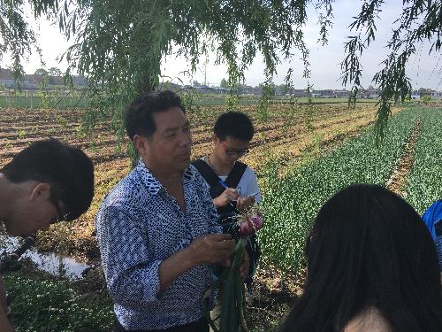 在负责人罗恩后老师的带领下,到洋葱地里进行一上午的观察、学习。罗老师不断强调,洋葱种植学习一定要实践与理论相结合,他通过比较分析病变洋葱和普通洋葱的形态差异来向队员们详细地讲解了在洋葱种植过程中可能出现的问题以及解决方法,让队员对其有了初步的了解。随后,他又讲解了洋葱育种过程中需种量,施肥等注意点,讲解期间,罗老师提出多个问题,让队员们进行角色互换,以一个老师的身份去陈述洋葱的整个育种过程,使队员的知识更加巩固。