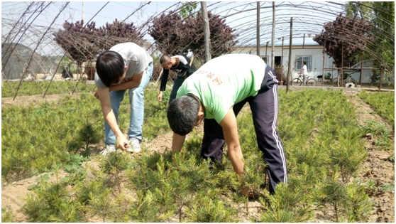 没有了初行的激动,一行五人带着微笑上路。阳光依旧,惠风和畅。到达合作社之后,迎接队员们的是老大爷亲切的笑脸,大家得知本次的任务后,来不及享受绿野清凉,带着锄头铲子就开始了今天的工作——锄草。杂草与植物争肥水,除草后肥水会集中供给植物,使植物长得更好。老爷爷告诉队员要“宁除草芽,勿除草爷”,也就是说要把杂草消灭在萌芽时期,除早,除小,除彻底,不能留下小草,否则就会增加以后的工作量。烈日炎炎,但是队员们并没有叫苦叫累,大家分工明确,工作认真,虽然汗水湿透了衣服,泥土打脏了鞋子,但是他们脸上绽放着最美的笑容。