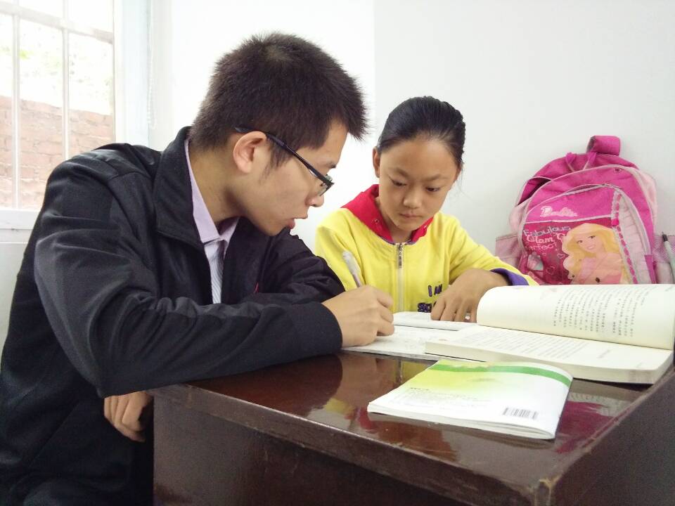刘涵宇在认真辅导孩子作业