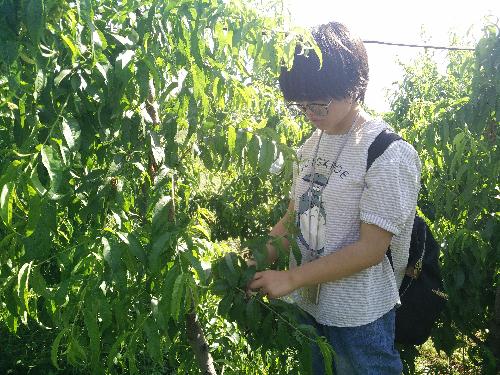 在队伍到达合作社之后,合作社负责人带领队员们进入果园,认真负责地给队员们教授桃树套袋的技巧和相关注意事项,而每一名队员也都在认真听负责人的讲解。待负责人讲解结束后,队员们就迫不及待地开始了套袋工作。虽然天气炎热,但是队员们没有一人喊苦喊累,纵然汗流浃背,却都一直在默默坚持,从一开始套袋的手忙脚乱到熟练地完成一棵桃树的套袋工作,合作社负责人在一旁也忍不住点头并称赞道:“咱西农的同学们工作起来很认真也很勤奋,还不怕吃苦,大家要常来呀。”田园使者队长张裕川在活动结束后表示:“本次活动的开展很有意义,虽然今天很热,但我们每个人都在坚持并在实践中学习到了课本上学不到的知识,这应该就是田园使者活动的意义所在了。”