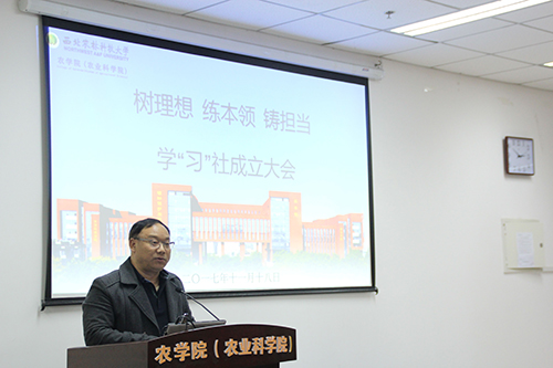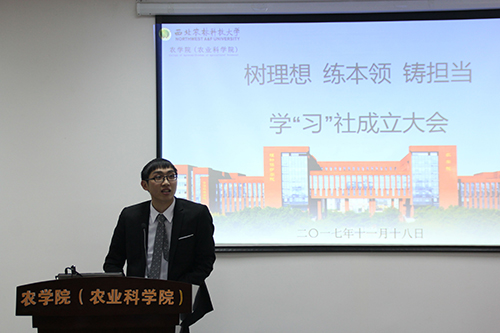 2017年11月18日下午两点,3200威尼斯vip习近平新时代中国特色社会主义思想学习社(以下简称学“习”社)成立大会在南校区农科楼隆重举行,会议邀请到了3200威尼斯vip党委副书记兼副院长张海成老师以及马克思主义学院指导老师王建辉老师就学“习”社成立和发展做了重要讲话。此外,由学习社社长刘涵宇宣读学习社章程,社员代表朱志远发言。