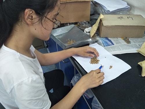 今天的任务主要有两项,称量出各种小麦的千粒重和红外蛋白分析。在研究生学长和学姐的指导下,八个人很快开始了各自的任务。先看称量千粒重的小组成员,只见他们先拿出黑色的百粒板,数出百粒小麦后,称量计重,重复三次。数出百粒小麦的过程是非常枯燥的,但队员们脸上并无烦躁之色,只是专注地做好本职工作。而观之红外蛋白分析的小组成员,则轻松很多,只需将样品放入分析仪中,操作按钮即可。简单却也需谨慎,稍有差池分析结果便会有问题,更甚至还会损伤仪器。幸好队员们都分工明确,各司其职,出色地完成了今天的任务。