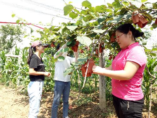 从六月到九月,队员们见证了猕猴桃的成熟。第一次活动时秦凝同学说过:“以前从来不认识猕猴桃树,这是第一次这么近距离地接触它,瞬间就引起了自己的兴趣,回去一定要去图书馆找书看。只有多了解了,才能把田园使者活动做得更好。”