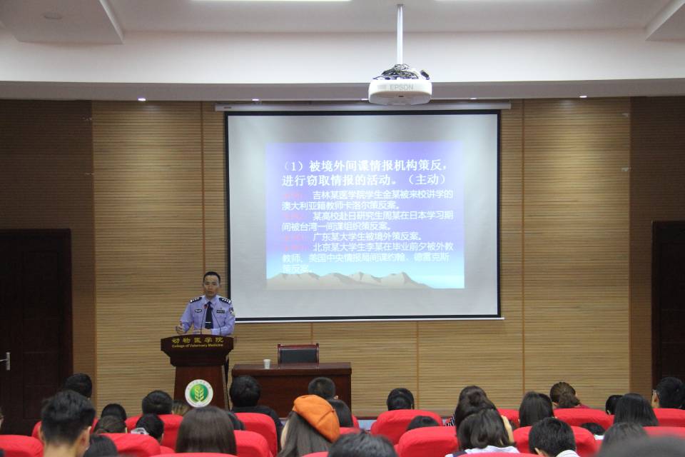 9月29日傍晚,由农学、人文、食品、动医四院权益部联合举办的以“维护国家安全,我们在行动“为主题的大学生国家安全教育报告会在北校区动物医学院报告会举行,报告会由国保反恐支队支队长、公安部国保青年人才张永春警官主讲。
