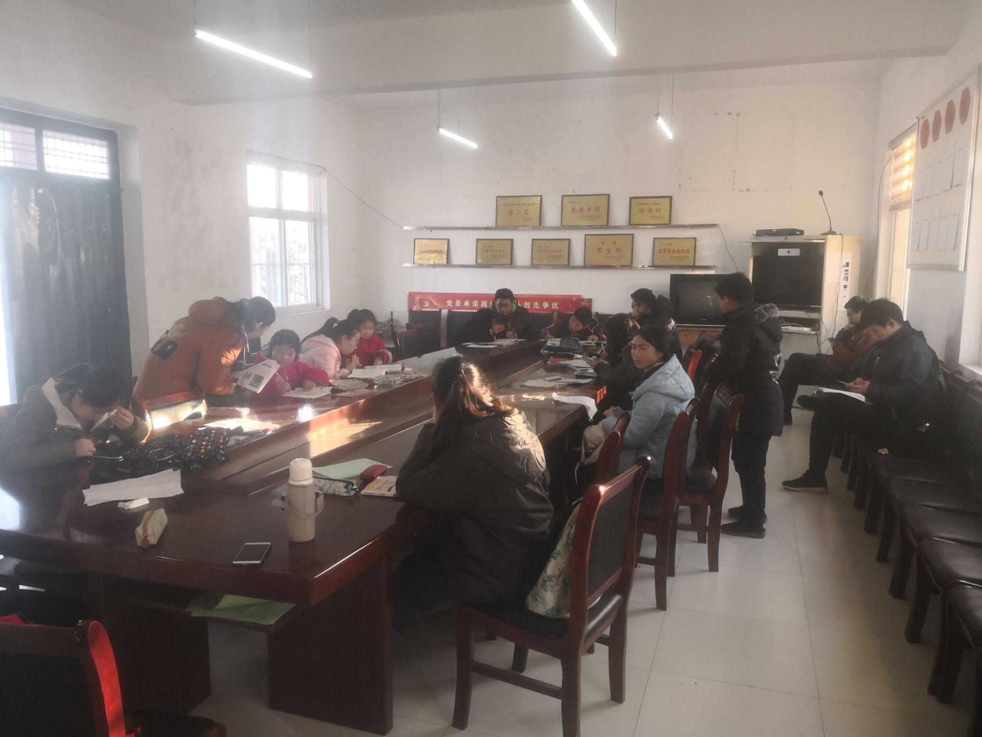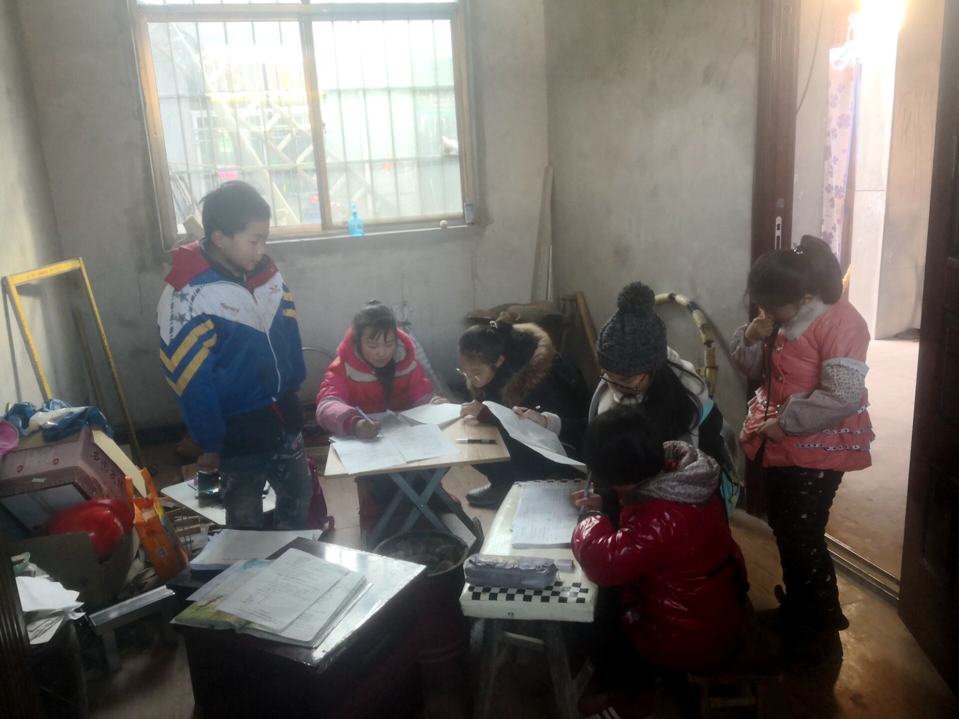 与曹新庄完全不同,孟家寨村的村委会破旧,会议室里的气温和室外近乎一样寒冷,屋内中间很明显的一张大桌子虽然足够孩子们使用,但椅子数量不太够,而且上面布满了灰尘,小队成员们只能选择到小朋友家里去进行一对一的辅导。照例,同学们很快找到了自己带的孩子,在家长们又是拿板凳又是倒茶的热情招待下,检查并指导着孩子们的作业。孟妈妈给队长章美琪说,她很信任我们的支教,非常感激我们的支教,也很感动,令她印象深刻的是去年的支教队员们在母亲节去她们家包了饺子,还拍了合照。说着,孟妈妈还特别给章美琪看了合照,大家也都非常好奇的凑过去看,相顾一笑。