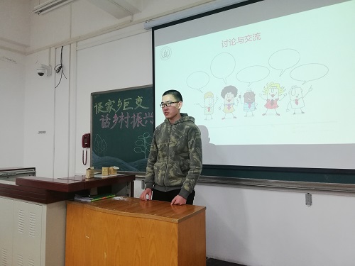 活动的第二个环节中,主持人首先播放了《乡村振兴》视频,让同学们了解了改革开放后乡村振兴的历程。视频播放完毕后,参加乡村调研活动的同学们依次上台分享他们在调研时的见闻,并发表了他们对乡村振兴的看法。李文博同学说道:“我在调研新安村的时候,发现它与我想象的贫困村有差异,不是遍地哀民,与之相反的是良好的基础设施配件、恰当的精神文明建设、朴实而淳朴的民风。我感叹正是大家齐心协力在党的领导下,一步一个脚印,让乡村振兴落到实处。”上台分享的同学们都感慨乡村发展之快超出他们的想象,也都纷纷表达出此次乡村调研活动非常有意义。