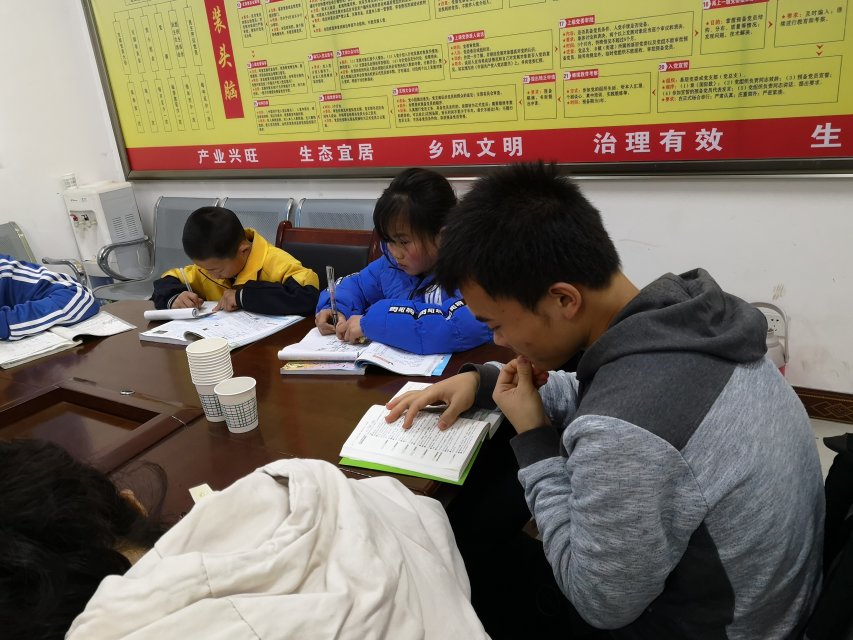 在互相介绍完后,就进入了正式的辅导环节。孩子们以小学生和初中生为主,志愿者们根据自己擅长的学科,找到有相应需求的孩子进行一对一辅导。二、三年级的小朋友虽然作业不多,可都在非常认真地写着,志愿者们看到他们写错时,也都会指出并把正确的做法耐心地讲给孩子听。有两位即将面临的中考的初三的女生作业比较多,难度也比较大,几位支教志愿者经过一番讨论后,才把她们的问题解决。