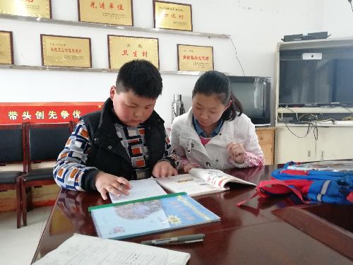 会议室内气氛活跃,除了完成周末作业之外,志愿者还担任起了小老师的任务,村助闫佳丽辅导的六年级杨蓥豪小朋友,在完成自己作业之后,主动提出想让小老师听写单词,闫佳丽同学听写完之后,又带领他预习即将学习的内容。小朋友们对知识的渴望和认真,切实触动了志愿者们。
