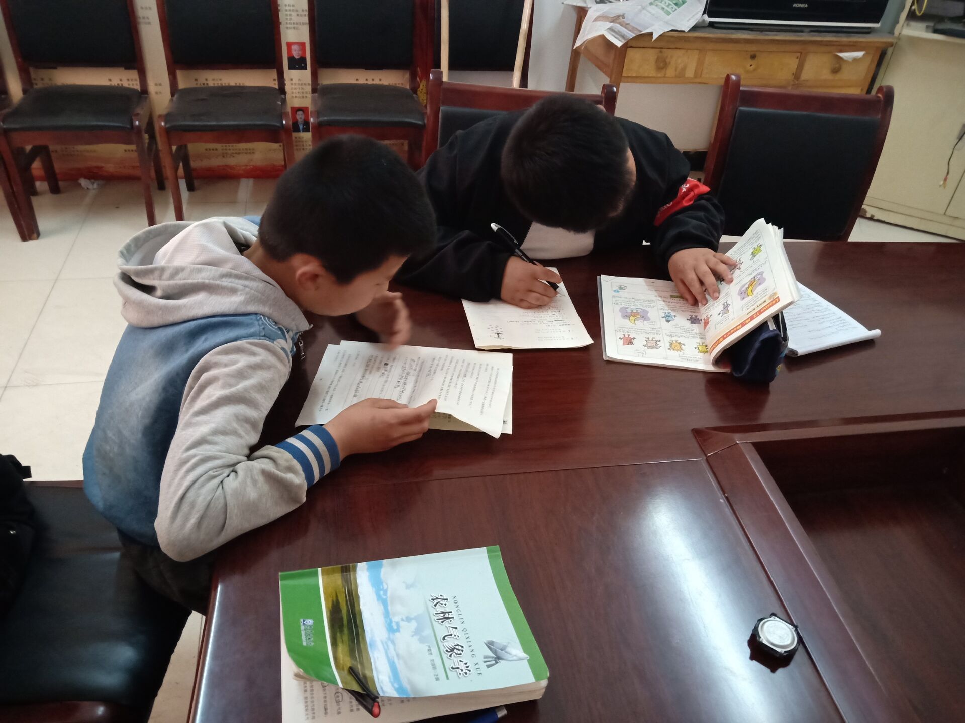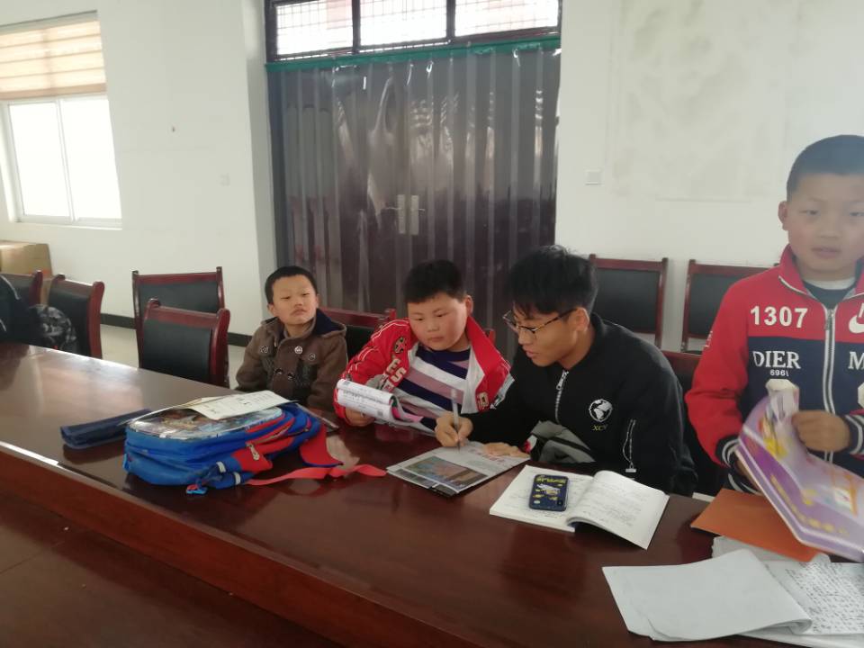 支教的同学们于当日早七点五十在西雕集合,清点好人数之后,同学们八点准时从北门出发,经过近半个小时的骑行,到达了曹新庄村委会。同学们首先根据村里提前统计好的信息,分头进入村庄中寻找孩子们,把孩子们都集中在村委会大会议室内。根据需要进行辅导的孩子的人数,对志愿者和孩子们进行匹配。孩子们的年龄跨度较大,下至小学二年级,上至初中三年级,辅导的科目也涵盖语文、数学、英语、化学等各个学科。