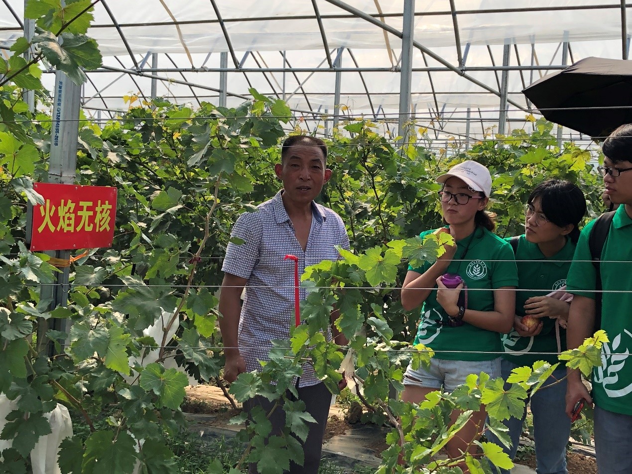 队员们紧跟书记步伐,苹果红了,娇艳欲滴,书记摘了些给队员们品尝,味道比蜜还甜。路过葡萄园,书记指着“焰火无核”、“美人指”等品种的葡萄说,“这是西农在我们这的实验基地呢!西农真的帮了我们很多,咱们农民都特别感动。”正说着书记就摘了一串套好袋的红提,给队员们解解夏日的炎热。经过一圈细致的考察,书记和队员们回到了农村书屋。稍作歇息后,书记语重心长地对队员们说:“这些产业都有一定的规模了,但就是销售有点问题,基本还是包给外地”书记的眼中稍微有些哀愁。