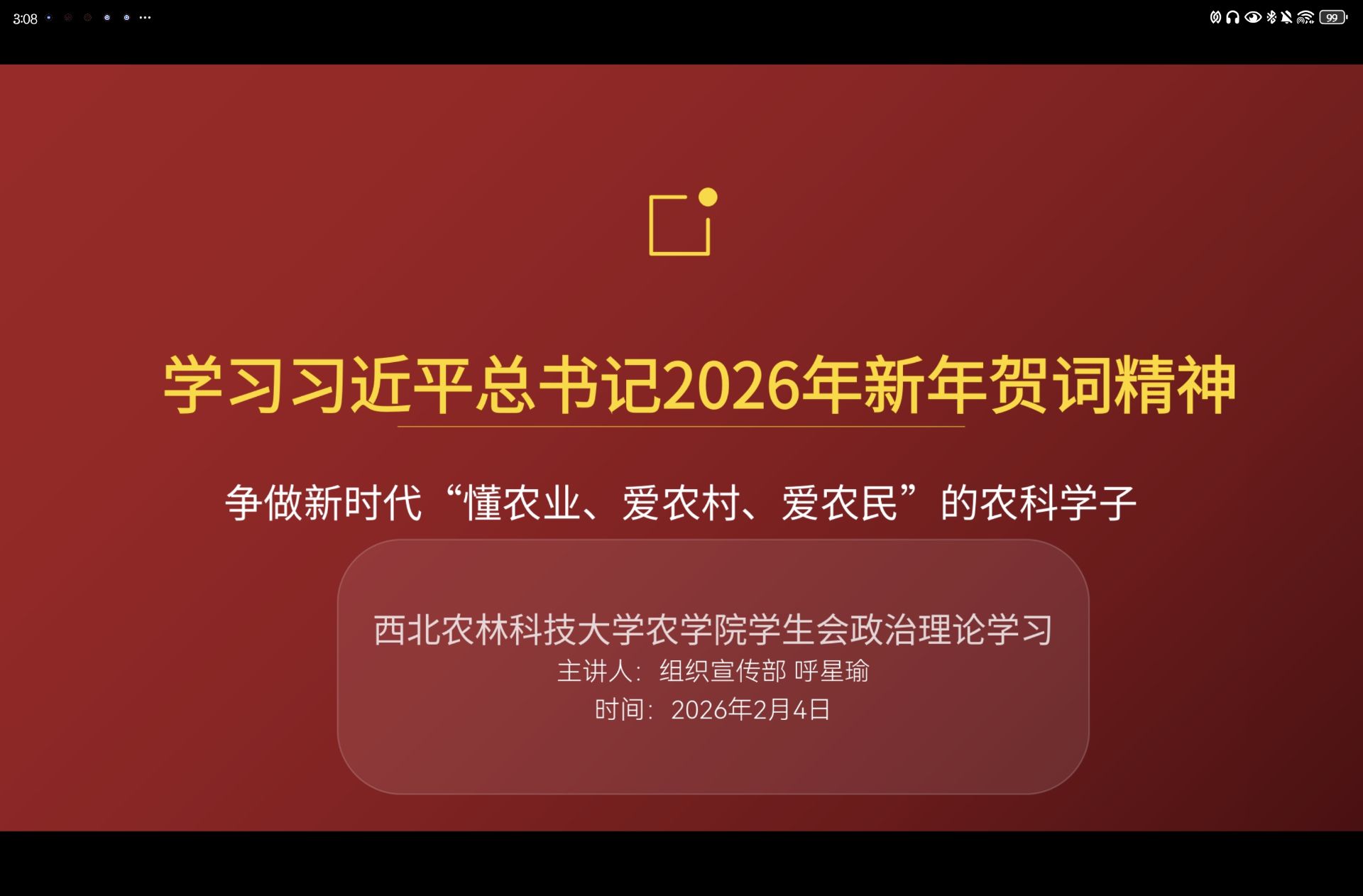 本次学习以习近平总书记重要贺信精神和党中央致词精神为核心主题,聚焦2026年新年贺词中的重要论述与精神内涵,引导学生会骨干深刻领会新时代青年的使命担当。学习过程中,全体骨干认真聆听、深入思考,围绕贺词中关于青年成长、家国发展、奋斗实干等重要内容展开学习交流,进一步筑牢思想根基、坚定理想信念。