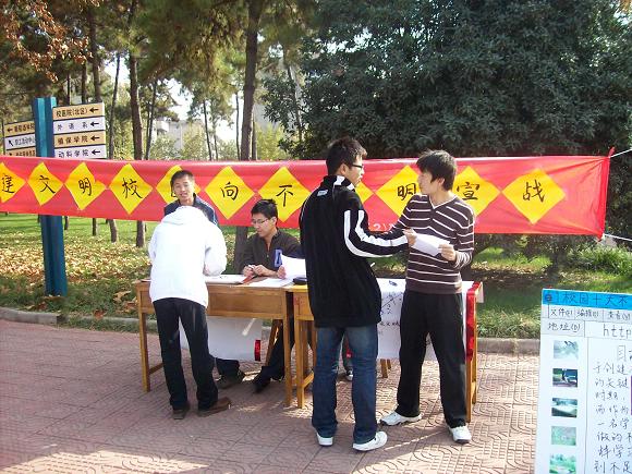 活动之前一周内经过对在校师生随机调查,总结出32条校园中的不文明现象,然后集中评选,活动当天共发放调查表500余份,回收率达100%,并有百余名同学自愿签名,表达了他们与不文明行为抗争到底的决心。