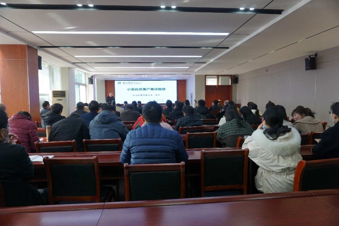 我校教授们在南阳市农业科学院举办了“小麦优质高产高效栽培”、“小麦×玉米双单倍体快速育种技术探讨”和“在乡村振兴中切实推进科技兴农”的培训会。培训会由南阳农科院院长袁璋主持,南阳市农业科学院和南阳市种子管理站80余名农技干部参加了本次培训会。王东教授针对当前小麦生产中存在问题,从构建合理耕层、科学规范播种和肥水精准调控等方面深入浅出地讲授了小麦绿色优质高效栽培过程;闵东红教授详细地介绍玉米花粉诱导小麦双单倍体育种技术的创制和应用;杨乙丹教授回顾了乡村振兴战略的五年历程,并重点解读2022年中央一号文件。