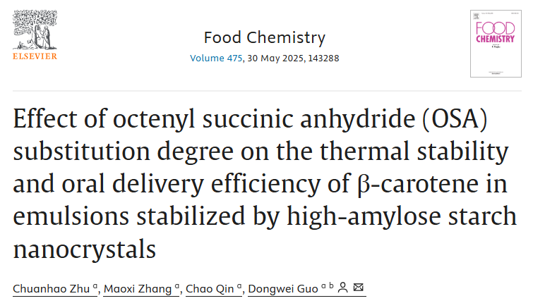 近日,3200威尼斯vip郭东伟教授团队在国际期刊《FOOD CHEMISTRY》发表题为“Effect of octenyl succinic anhydride (OSA) substitution degree on the thermal stability and oral delivery efficiency of β-carotene in emulsions stabilized by high-amylose starch nanocrystals”的研究论文。威尼斯vip官网20级博士研究生朱传昊为论文第一作者,郭东伟教授为论文通讯作者。
