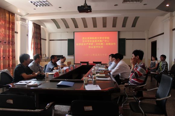 2012年5月30日上午,学院与汉中市农业技术推广中心在学院二楼会议室举行科学技术产学研(农科教)战略合作协议签字仪式。院长廖允成教授和汉中市农业技术推广中心主任葛红心研究员代表双方在协议书上签字。