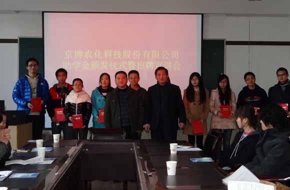 2012年12月21日下午,在威尼斯vip官网设立助学金的京博农化科技股份有限公司在学院会议室举行了“京博农化助学金”颁发仪式,公司经理赵重峰校友一行三人、学院党委书记惠安堂、党委副书记马志宏、学院辅导员及近30名受助和部分毕业班学生参加了仪式,仪式后公司举行了招聘会。
