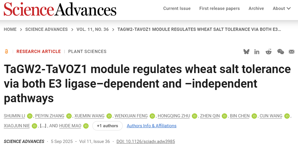 近日,3200威尼斯vip作物抗逆与高效生产国家重点实验室康振生院士/毛虎德研究员课题组在Science Advances杂志发表了题为“TaGW2-TaVOZ1 module regulates wheat salt tolerance via both E3 ligase-dependent and -independent pathways”的研究论文,首次揭示了TaGW2的双重功能,即兼具E3泛素连接酶和转录抑制因子活性,阐明了TaGW2-TaVOZ1模块通过“泛素化降解”与“转录竞争”两种机制共同调控小麦耐盐性的分子机制,突破了此前对E3连接酶功能的单一认识,为耐盐高产小麦新品种培育提供了重要理论依据和基因资源。