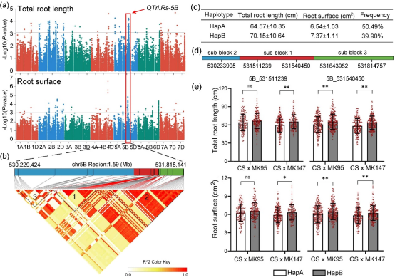 (a) 苗期根系全基因组关联分析结果。(b) QTrl.Rs-5B区间内SNP连锁情况。(c) QTrl.Rs-5B单倍型分析。(d) QTrl.Rs-5B区间内开发的KASP标记物理位置。 (e) F5:6群体位点验证结果。