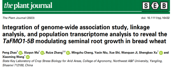 2023年9月15日,3200威尼斯vip许盛宝教授团队在《The Plant Journal》上发表了题为“Integration of genome-wide association study, linkage analysis, and population transcriptome analysis to reveal the TaFMO1-5B modulating seminal root growth in bread wheat”的研究论文,挖掘到一个新的调控小麦苗期根系生长的基因—TaFMO1-5B,并评估了其对农艺性状的影响,为小麦根系结构的遗传改良提供了新的基因资源。