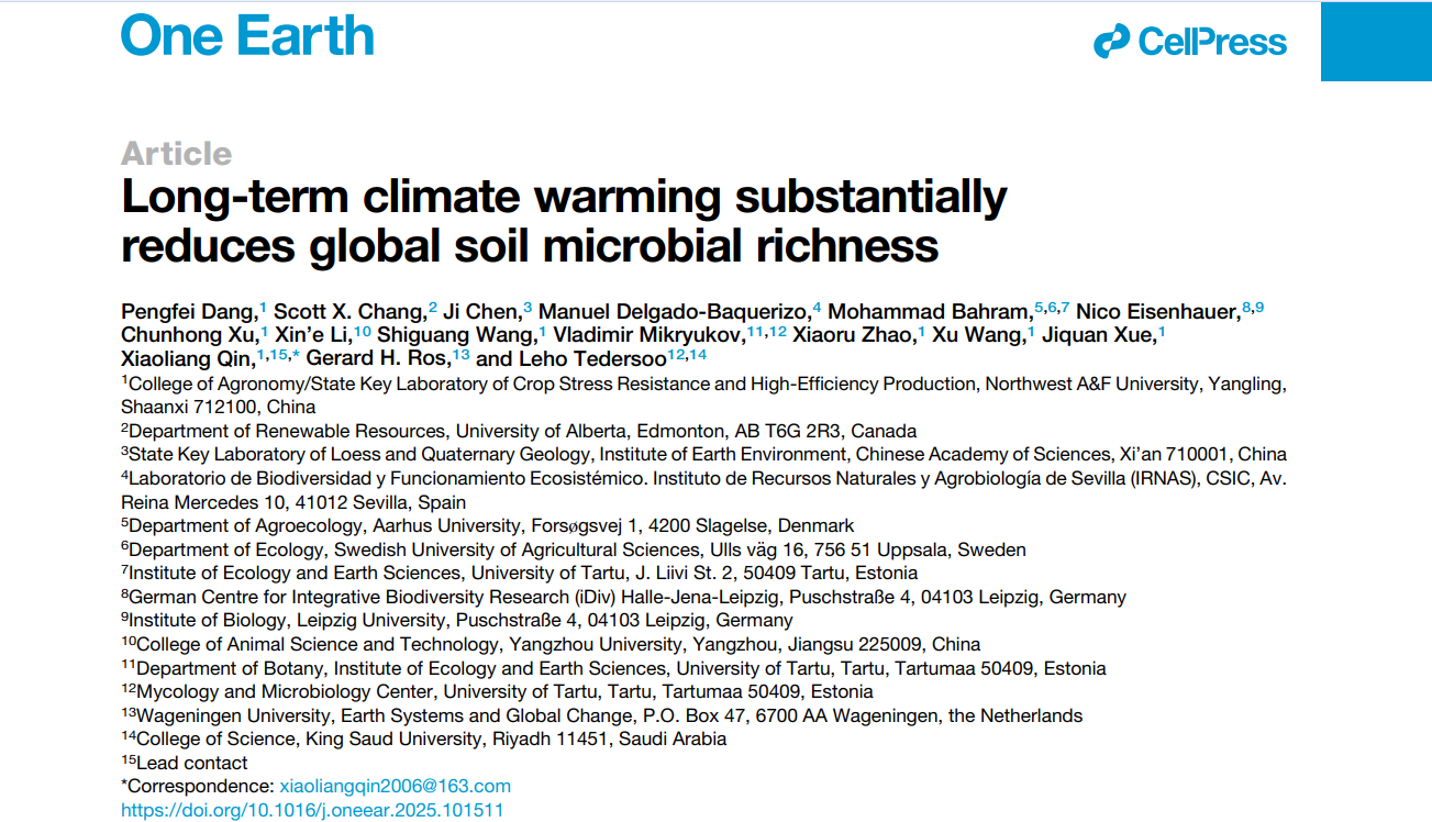 近日,3200威尼斯vip秦晓梁教授课题组的一项新研究登上了Cell Press官网头条,在Cell姊妹刊《One Earth》(五年影响因子19.2)上发表了题为“Long-term climate warming substantially reduces global soil microbial richness”的研究论文。该论文以西北农林科技大学为第一完成单位,秦晓梁教授为通讯作者,博士生党朋飞为第一作者。研究系统揭示了长期气候变暖对全球尺度土壤微生物多样性的显著负效应,并指出其对土壤氮循环功能的重要影响。同时,该研究明确了温度、降水及土壤养分等关键环境因子在调控微生物响应过程中的作用,为气候变化背景下不同生态系统的微生物保护与综合管理提供了科学依据。此项成果是课题组继在《美国国家科学院院刊》(PNAS)发表论文“Long-term climate warming weakens positive plant biomass responses globally”之后取得的又一重要进展。