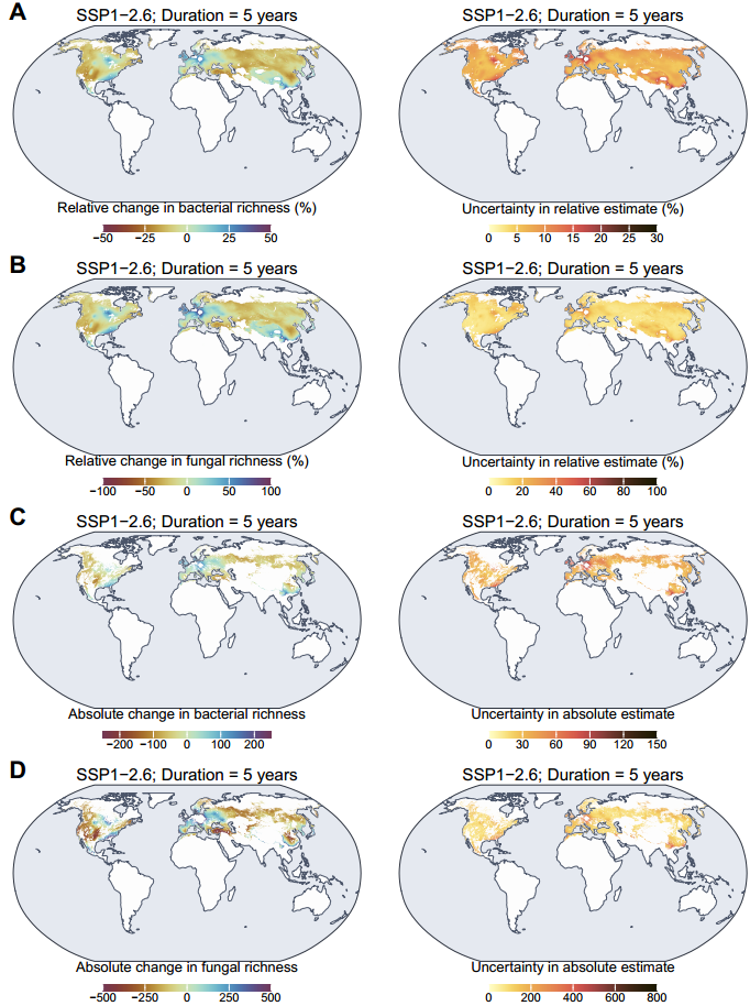 本研究预测了气候变暖和潜在变化,将“气候变暖”这个抽象概念,转化为具体的时间表、具体的数字和具体的地图,在SSP1-2.6情景下,气候变暖导致土壤细菌丰富度在1年和5年后分别下降2.8%和6.7%,土壤真菌丰富度分别下降4.0%和8.9%。研究明确指出了中亚和南美洲西部是微生物多样性下降的“重灾区”,其土壤微生物多样性下降最为明显,而我国青藏高原、西欧和南美洲东部则略有上升。