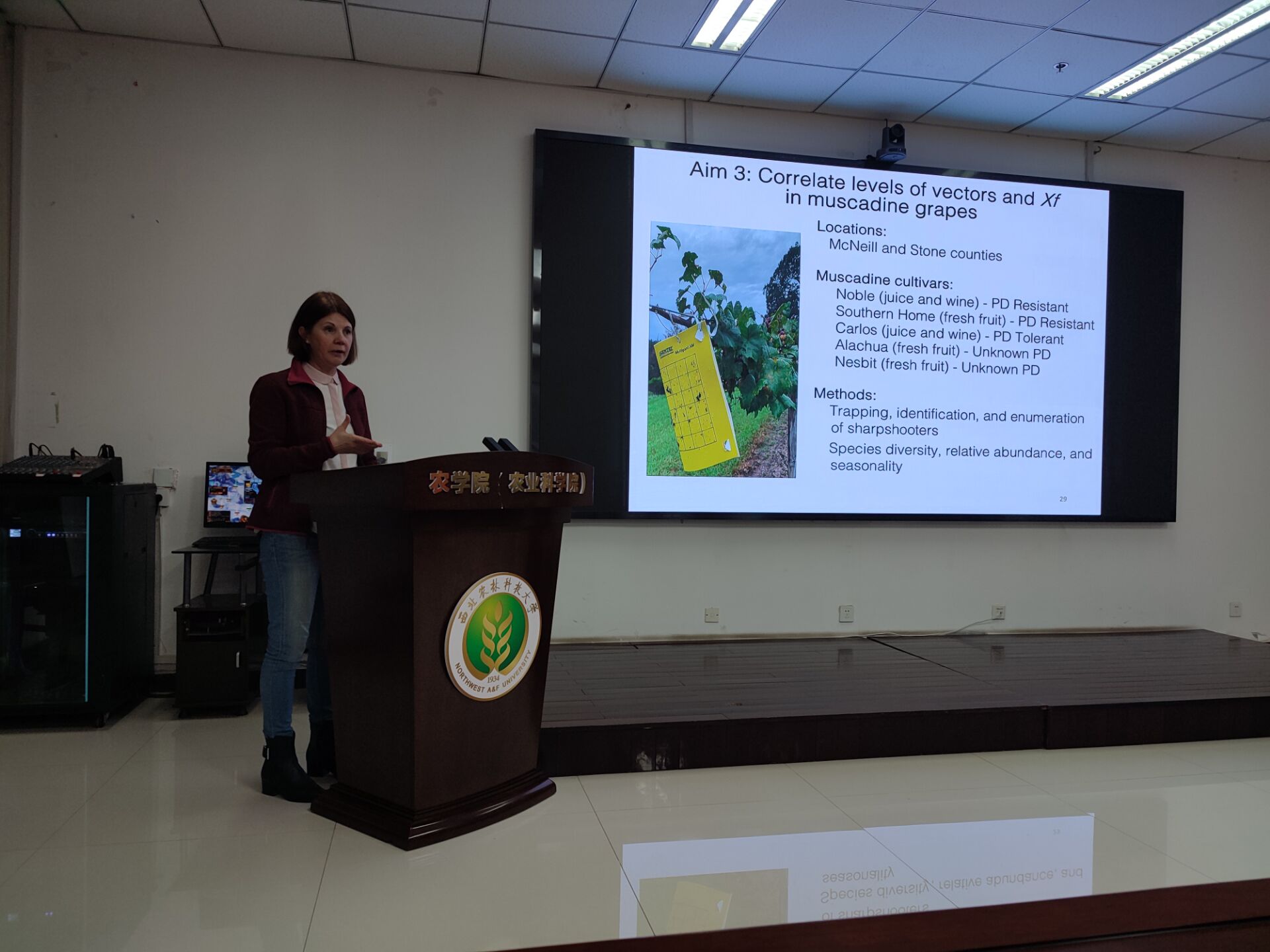 2023年12月22日上午,美国南密西西比大学 Olga Mavrodi应邀来威尼斯vip官网进行学术交流,为威尼斯vip官网100余师生做了题为“Xylella fastidiosa in bunch and muscadine grapes from the southern Mississippi”的学术报告。