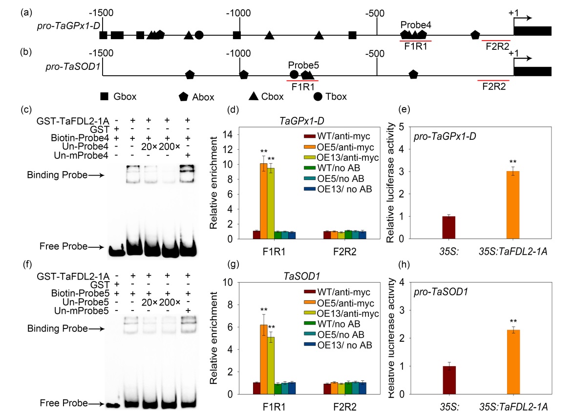 图1 TaFDL2-1A直接靶标TaGPX1-D和TaSOD1基因启动子并促进二者表达