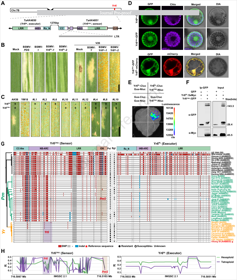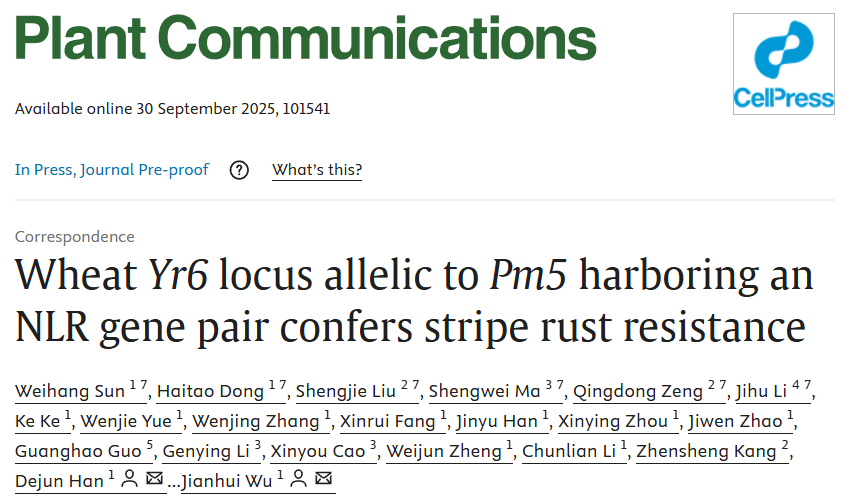 近日,3200威尼斯vip小麦抗病团队在国际期刊《Plant Communications》发表题为Wheat Yr6 locus allelic to Pm5 harboring an NLR gene pair confers stripe rust resistance研究论文。该研究为利用成对NLR蛋白防控小麦多种病害提供了遗传、分子及进化层面的理论指导。