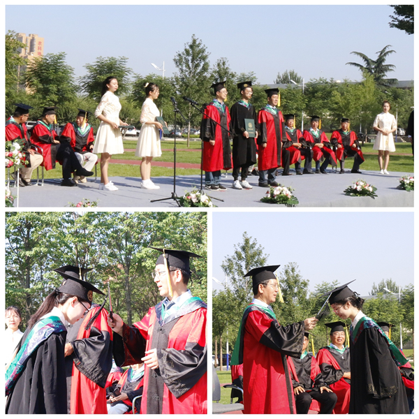 学院副院长韩娟宣读《关于授予汪寒冰等114名研究生硕士学位的通知》,院长单卫星教授和吉万全教授、薛吉全教授、陈新宏教授、郭东伟副教授为获得硕士学位的研究生拨穗,并颁发学位证书。