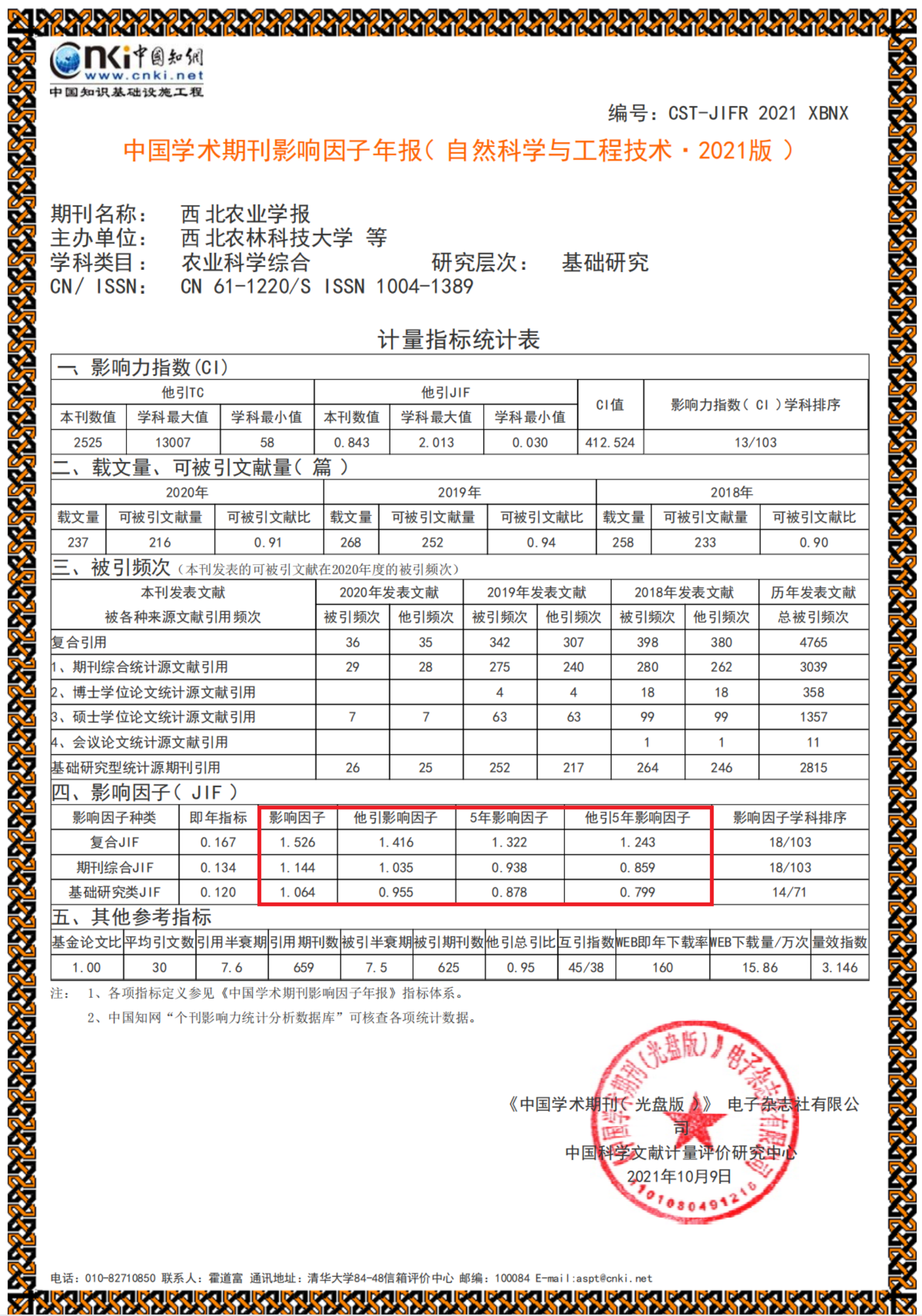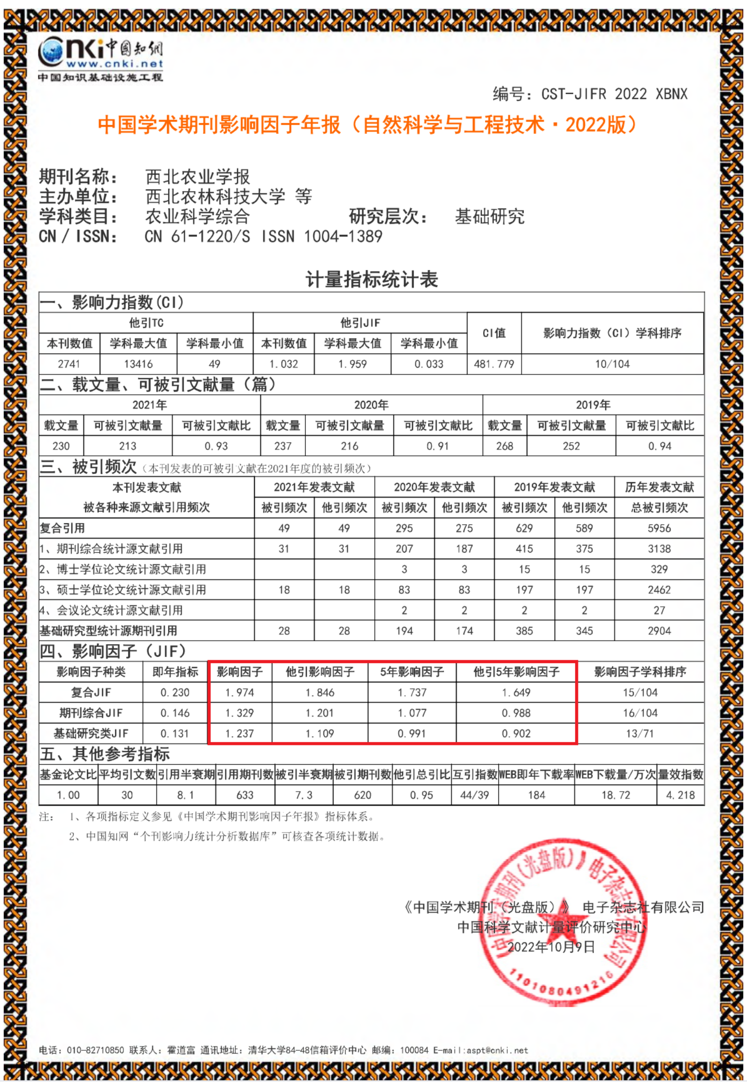 与2021年相比较,2022年《西北农业学报》影响力指数(CI)481.779,上升16.79%,学科排名10/104;期刊总被引频次5956,上升24.99%;期刊复合影响因子1.974,上升29.35%,学科排名上升到15/104;期刊综合影响因子1.329,上升16.17%,学科排名上升到16/104;基础研究类影响因子1.237,上升16.26%,学科排名上升到13/71;Web即年下载率184,上升15%;Web下载量18.72万次,上升19.39%。